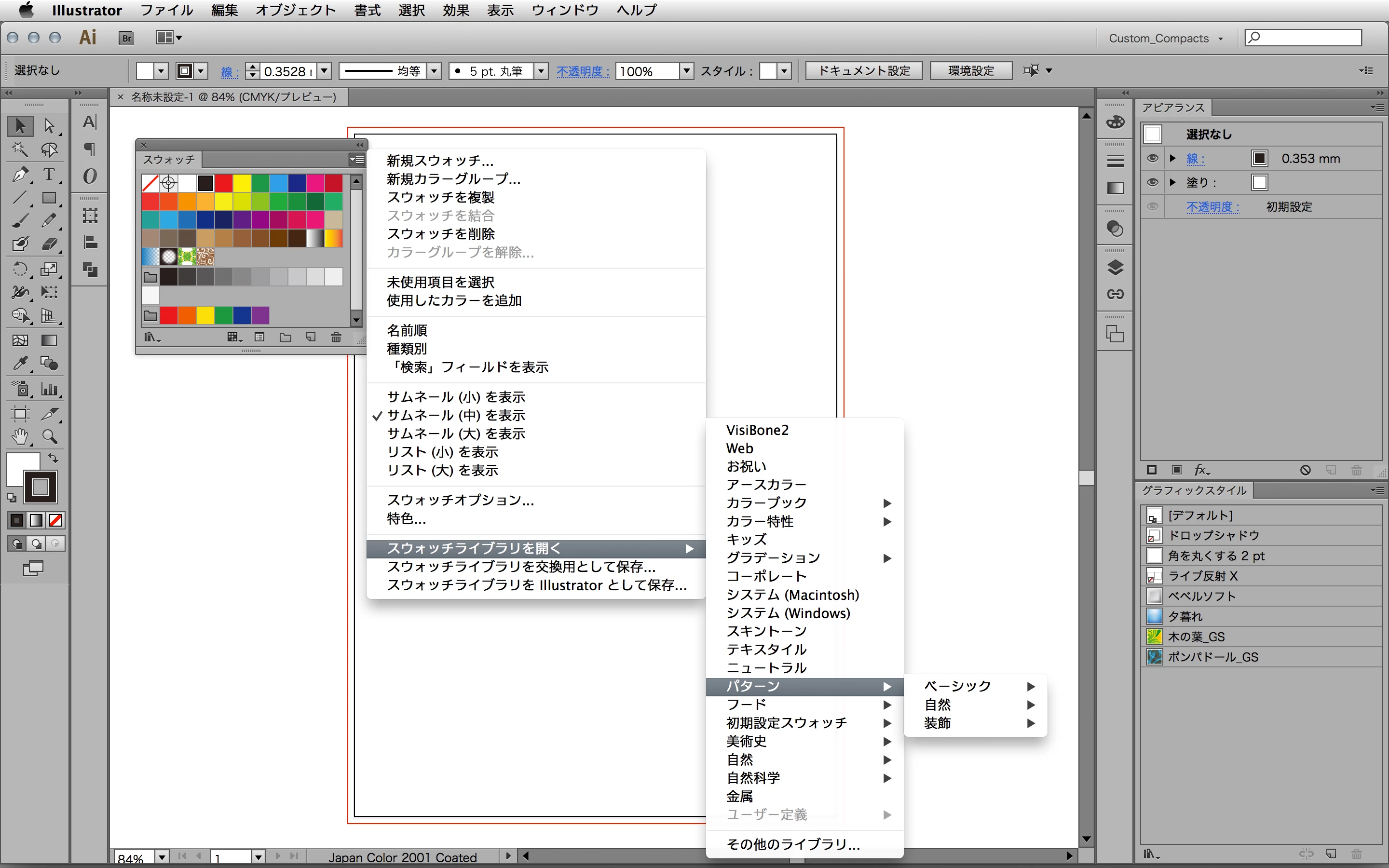 プリセットのパターンは、スウォッチパネルのオプションの中にあります。