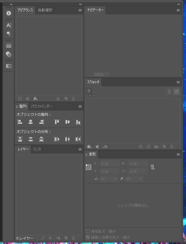 Illustratorを起動すると、フローティングパネル(スウォッチやレイヤーなどのパネル)がかならず閉じた状態になります。