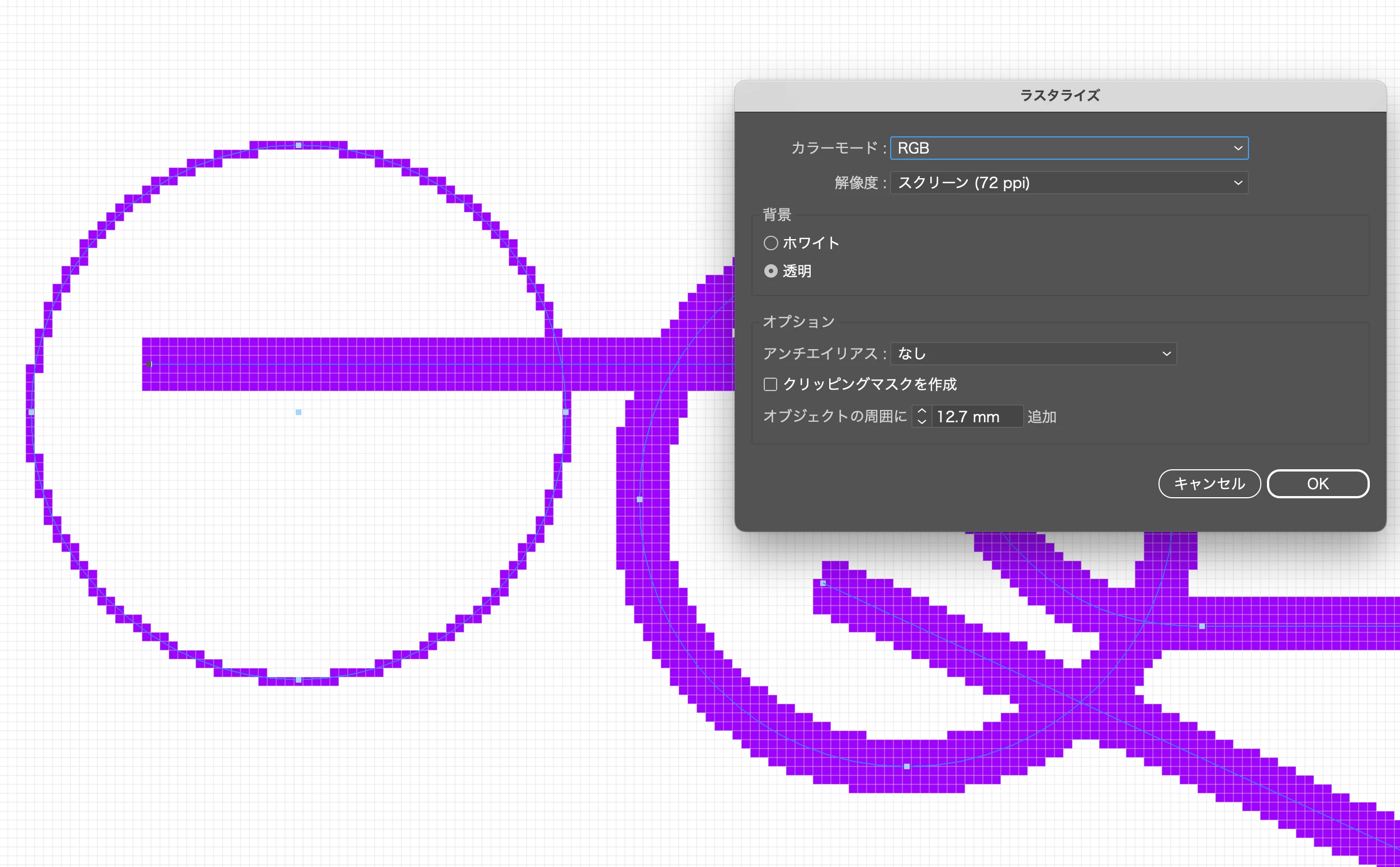 設定は表示/ピクセルにスナップ、表示/ピクセルプレビューを有効化した状態で描画しています。円などのクラウドがあるオブジェクトを、自動的にラスタライズした後のような描画にしたいのですが方法はありますか?よろしくお願いします。