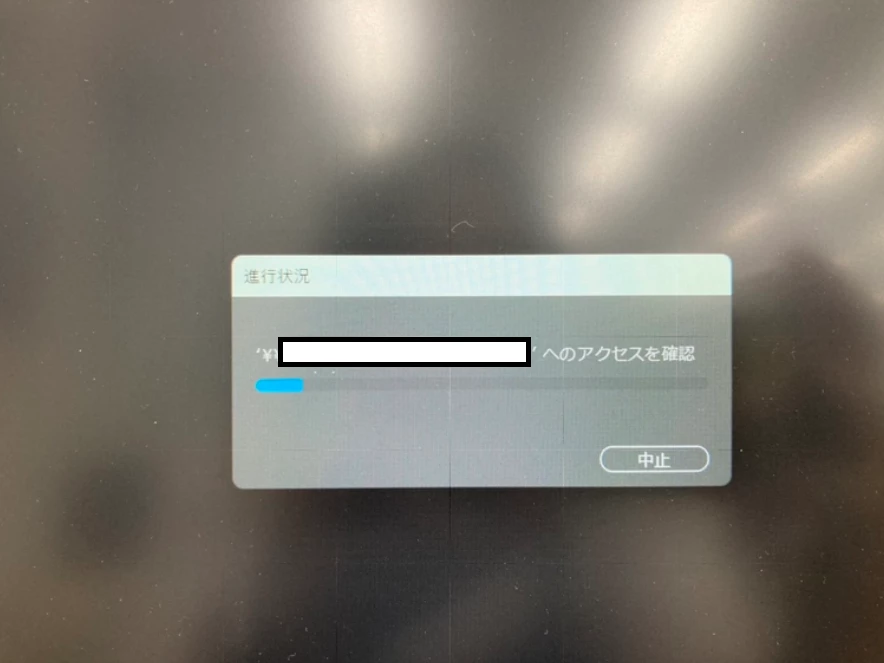 ファイルを開いた先に「進行状況:'{フォルダパス}'へのアクセスを確認」のポップアップが表示される