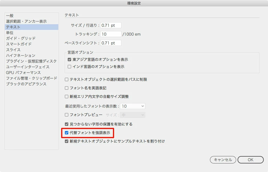 また、環境設定の「代替フォントを強調表示」にチェックを入れると、ドキュメント上でフォントが無いテキストオブジェクトが強調表示(ハイライト表示)されます。