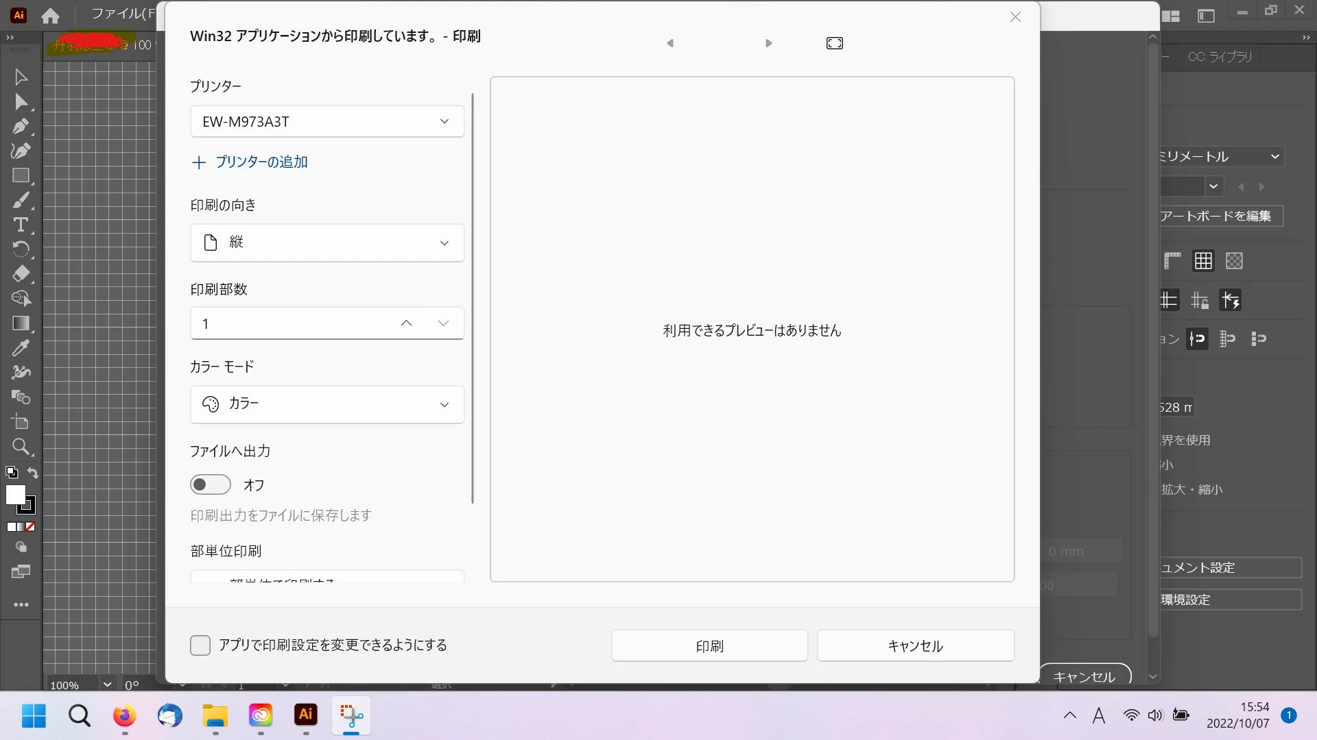 Adobe illustrator CC 2022でプリント時にプレビュー画面左下の【プリンタ】ボタンからプリンタの設定画面に行くはずが、【win32から印刷しています】のメッセージと共に見慣れない画面(添付)になってプリンタの詳細設定が出来ません。恐らく、本日10月7日のWindows11アップデートが影響していると思います。ちなみにillustatorアプリを一度アンインストールして、インストールしましたが改善されませんでした。詳しい方教えてください。
