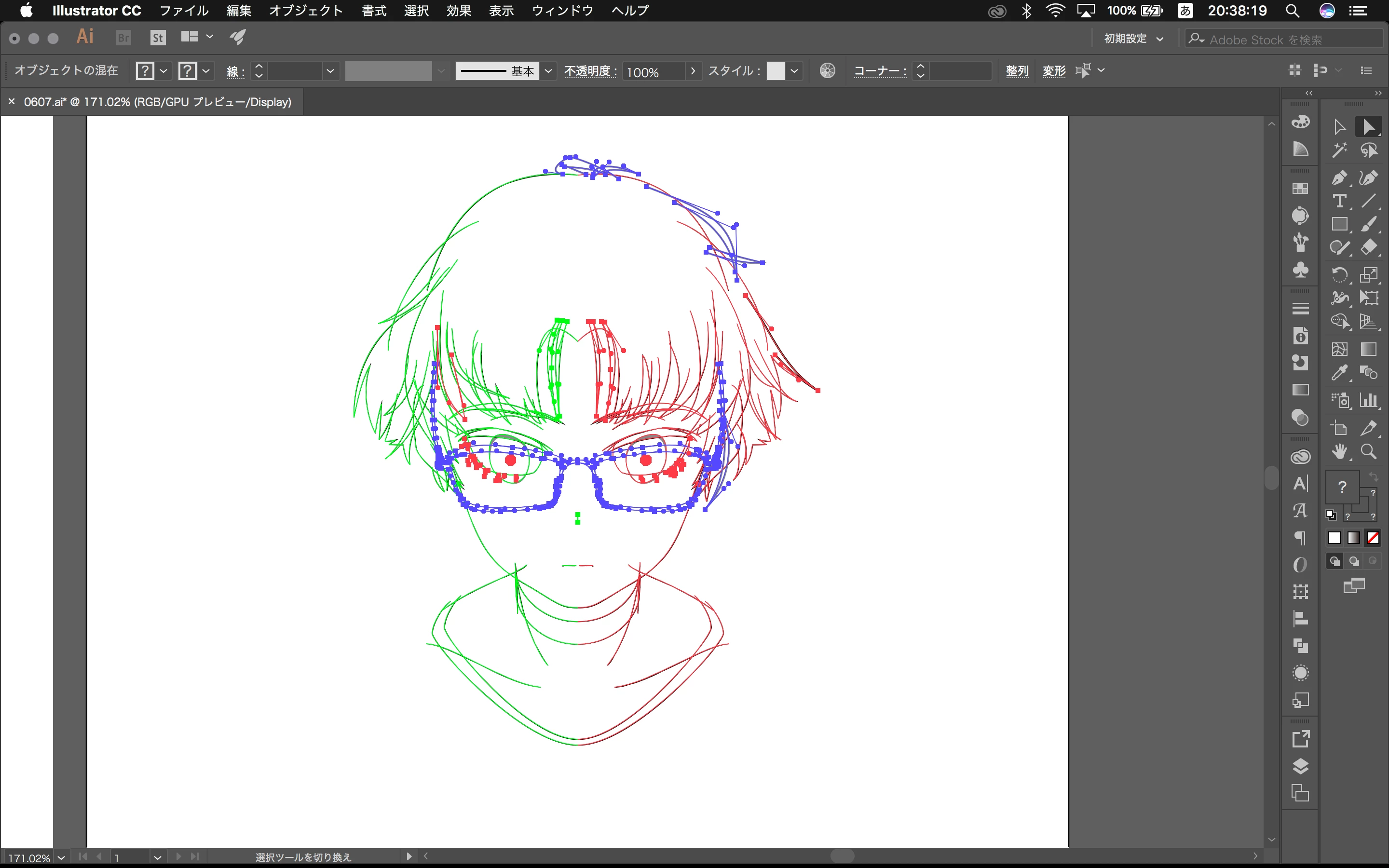 このとき,いかなるオブジェクトもロックされていません。ハンドルが表示されていない部分は曲線または直線パスです(単にアンカーポイント間の直線であるためハンドルが表示されていない,という問題ではありません)。ハンドルが表示されているパス・そうでないパスとはそれまで特に区別して編集しておらず,何がこのような表示の違いを生むのかに心当たりはありません。パスの強調色の色分けは所属レイヤー別なので,特定のレイヤーにおいて発生している問題ではないことがわかります。また,プレビューではなくアウトラインで表示したときのみ,元のように全ハンドルが表示されることを確認しました。