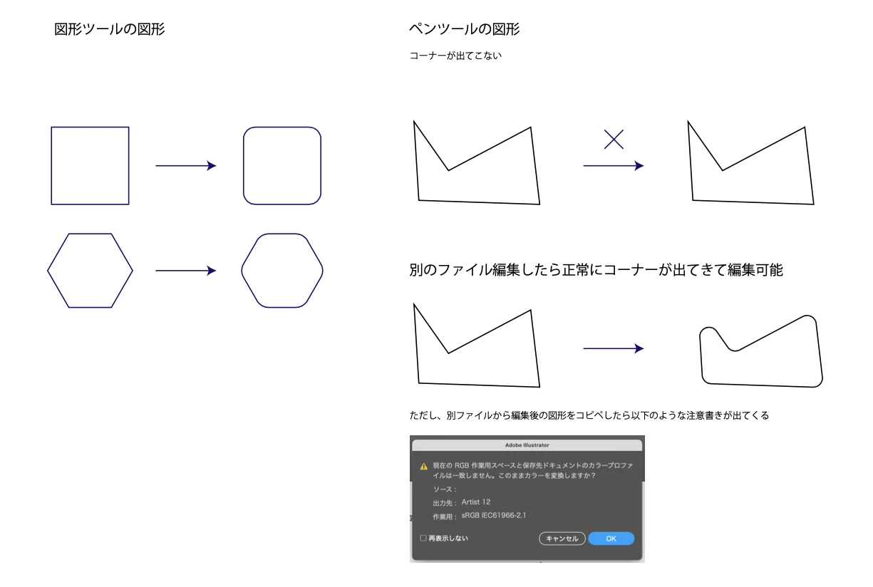 新規ファイルでは正常に動くので、そちらでコーナーの方を編集したのち、コピペすると以下のような注意書きが表示されます。