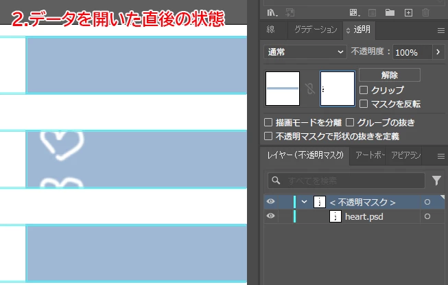 再度データを開くとマスク内の配置データが回転や位置の情報がリセットされてしまいます。