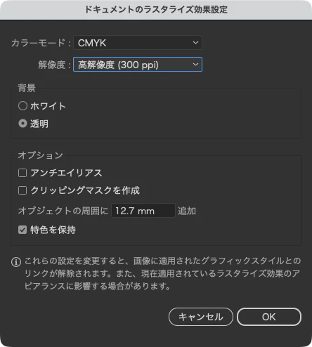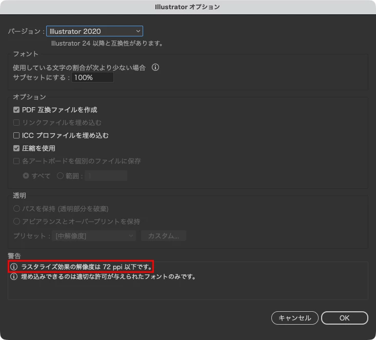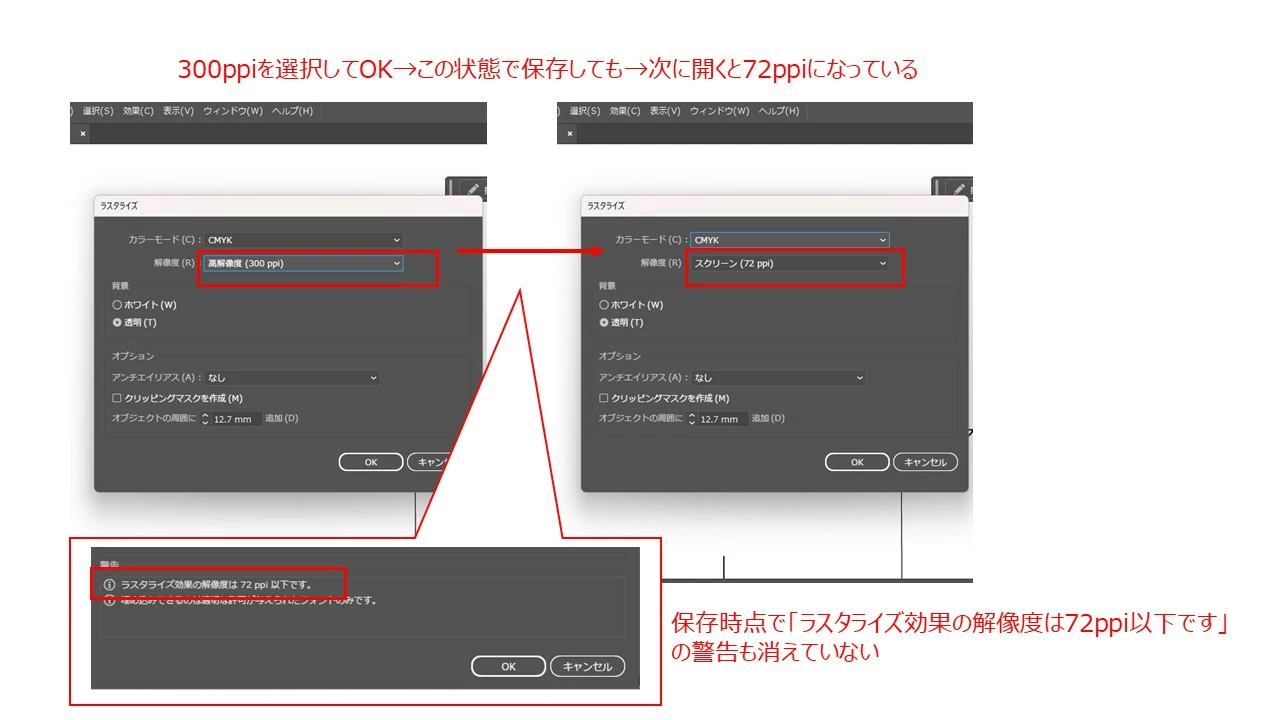 印刷会社へ入稿するのに「ラスタライズ効果設定は300ppi」と指定があったので、「効果」→「ドキュメントのラスタライズ効果設定」から300ppiに変更し、保存しようとすると、illustratorオプションに「ラスタライズの効果は72ppi以下です」との表示が出てしまいます。