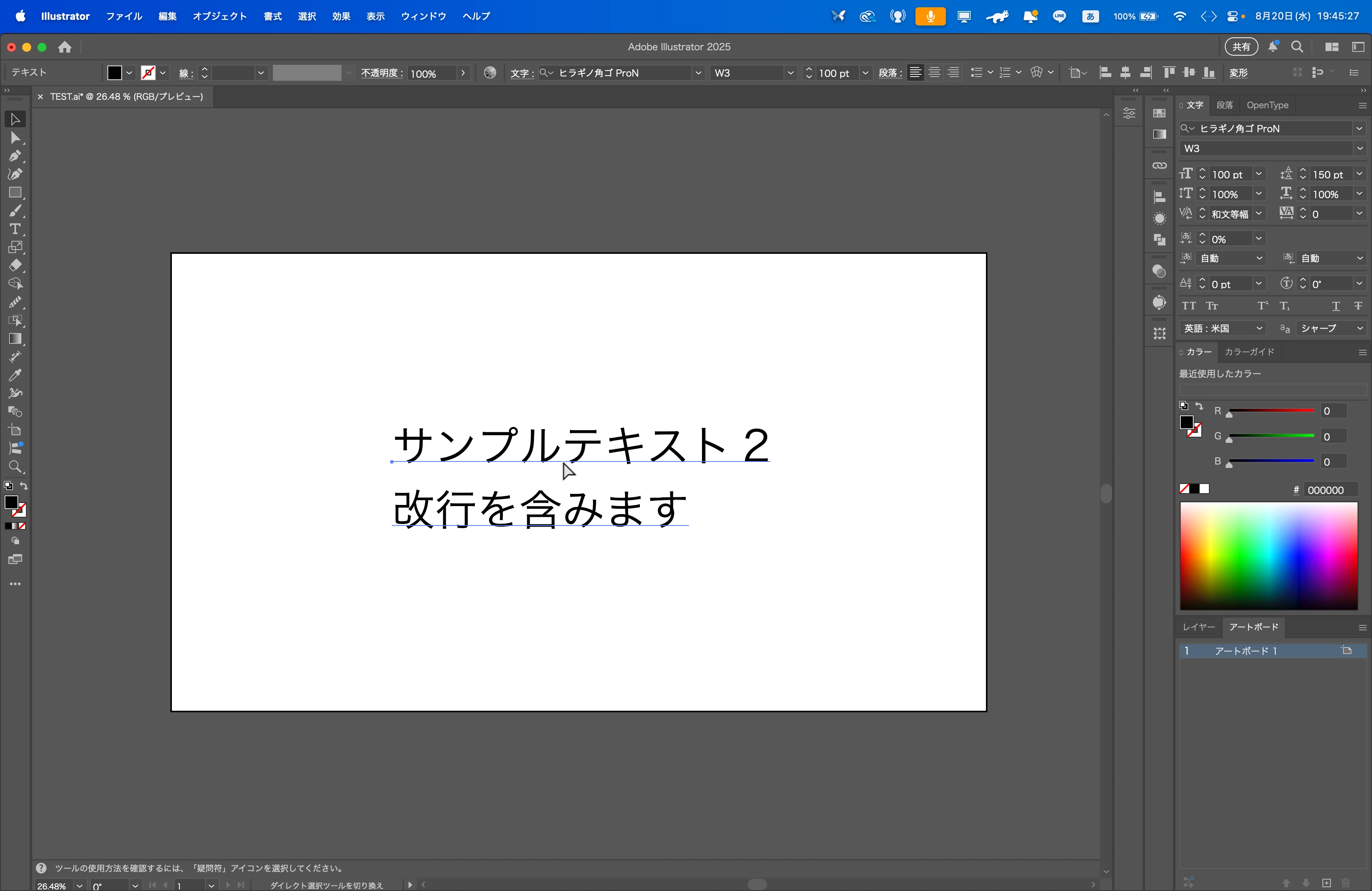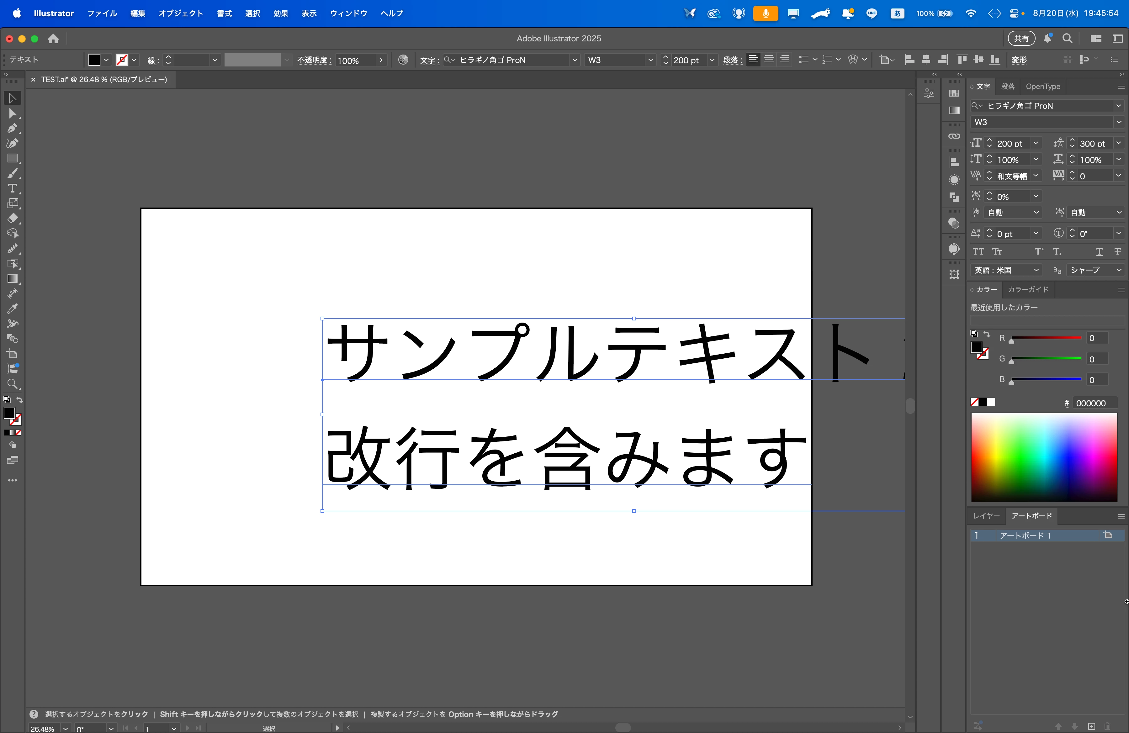 ①まずテキストオブジェクトを用意します。改行を含む必要があります。