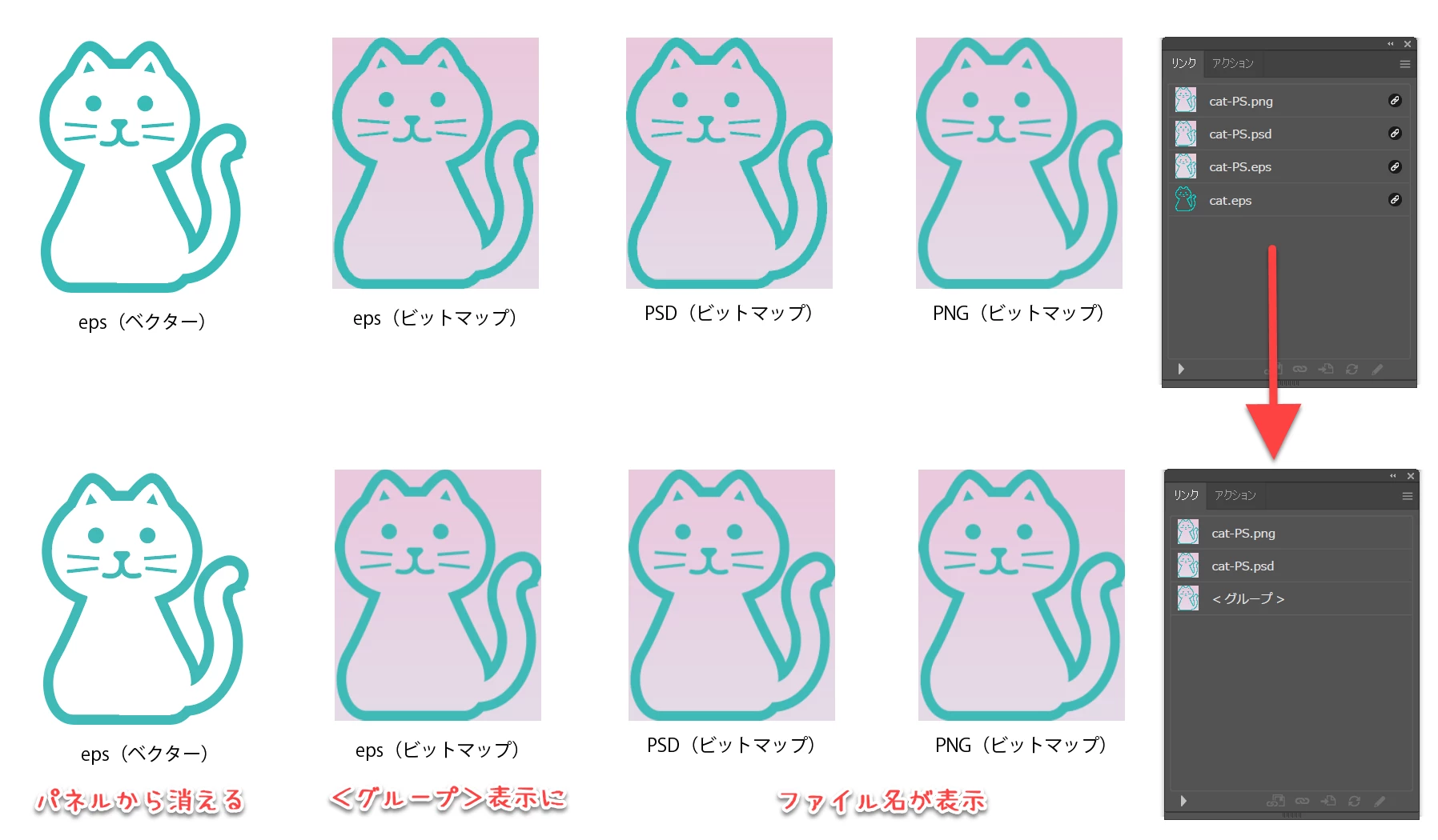 ビットマップ画像を含まないepsは、Illustratorのパスに変換されるため、リンクパネルからは消えてしまい、ビットマップを含む画像は、埋め込み後にグループになるようです。