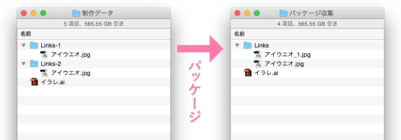 • パッケージの際[リンクされたファイルとドキュメントを再リンク]にチェックが入っていたので、同名ファイルは自動的にリネームされ、再リンクされた。これ自体はまったく問題ない。