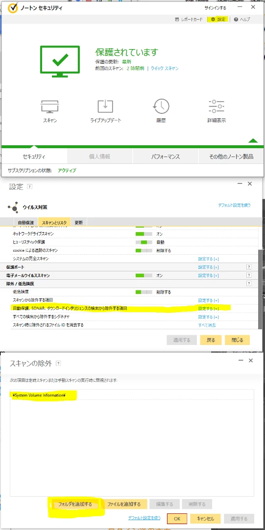 「Norton の自動保護の除外項目にCCのフォルダごと登録。」