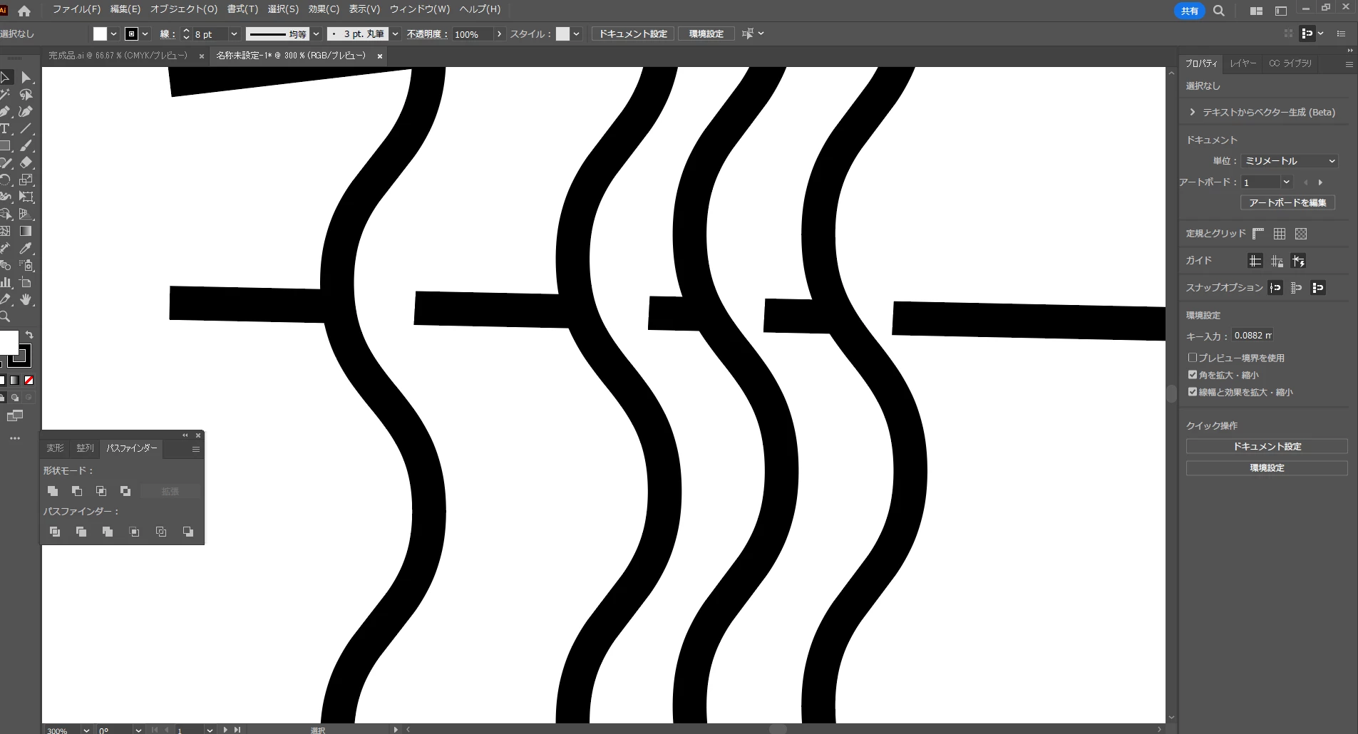 波線を選択したときにここ(画像の矢印)がこのように白色だと、波線の背面にある直線がその白色の塗りで隠れてしまいます。その場合は塗りをなし(赤い斜線のアイコン)にすれば解決します。
