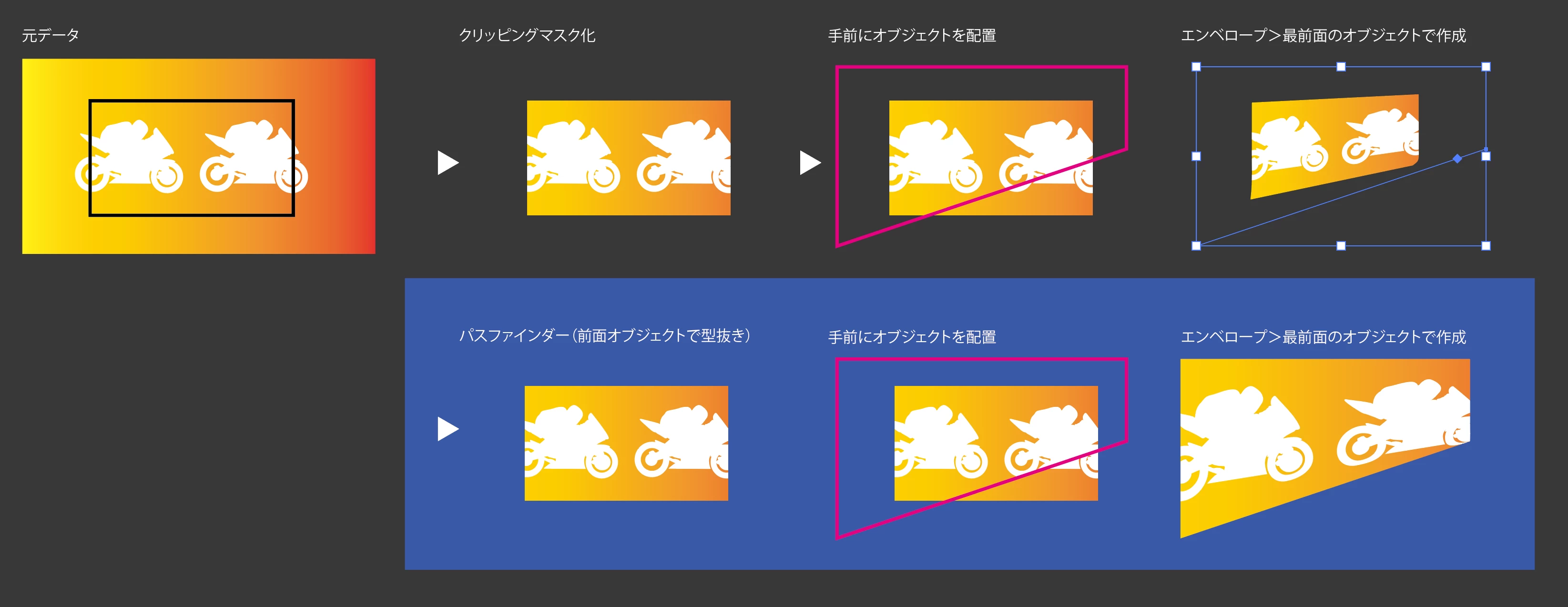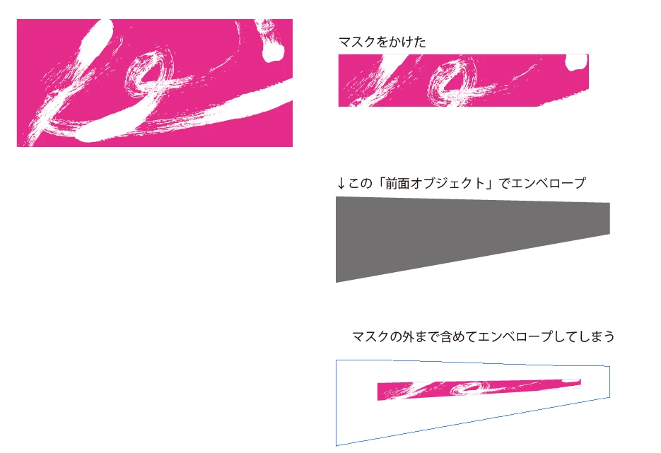 マスクはあくまでも、表示範囲を限定しているだけでオブジェクト全体は残っているので、エンベロープなどの変形をかけると全体に影響してしまいます。意図した結果と違う形になってしまいがちですよね。