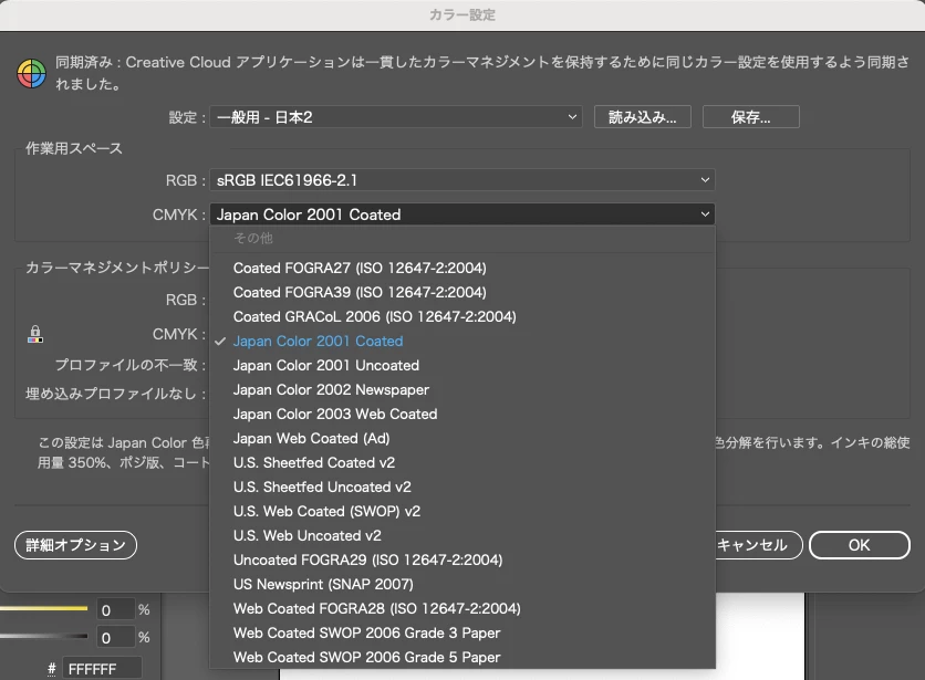 編集 > カラー設定 > 作業用スペースの「CMYK」には、Japan Color 2001 Coated をリストから選択したい。