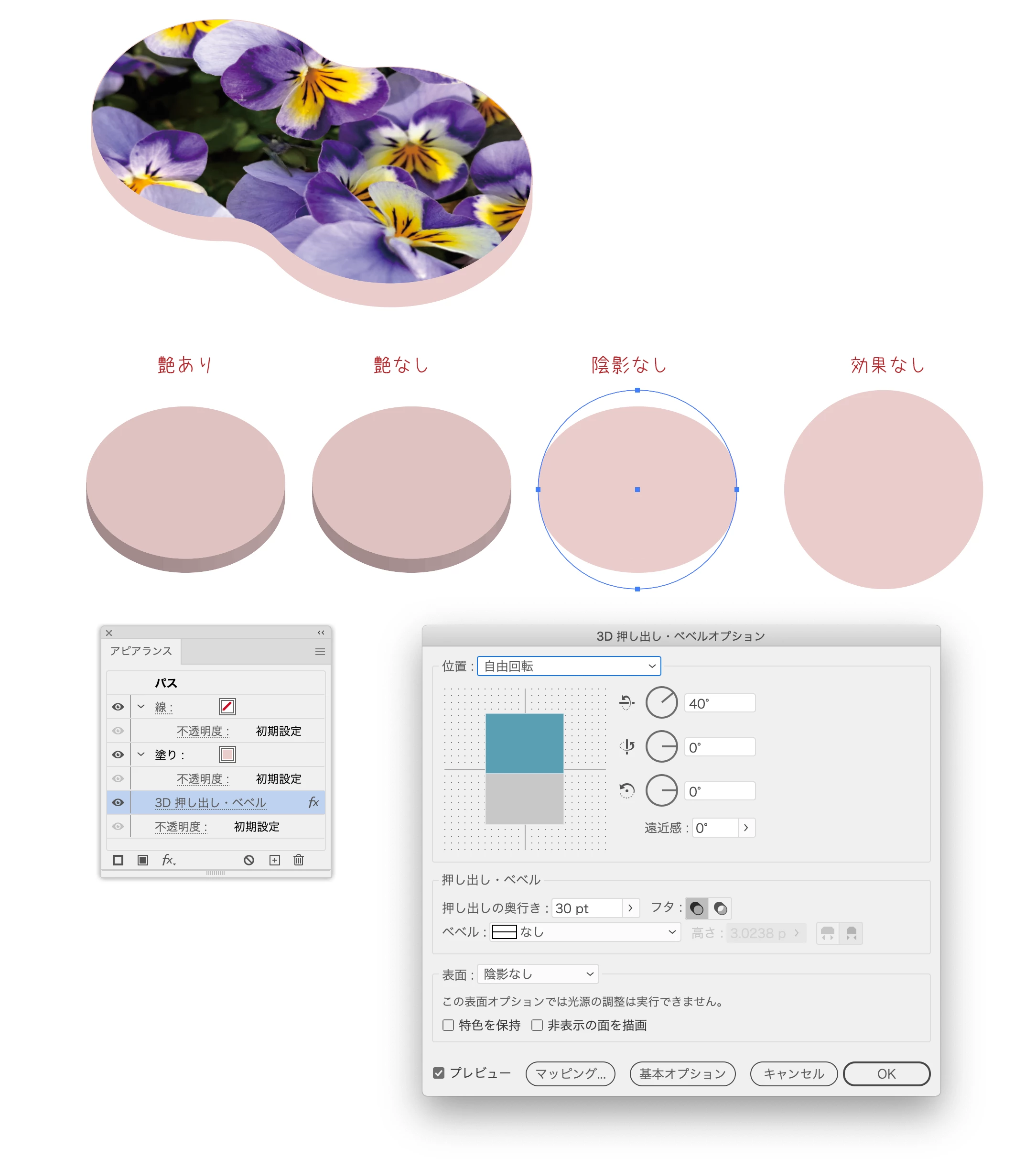 私なら、3D効果を使わずに、クリッピングに使用したパスをコピーし、背面にペーストして指定色にし、移動します。