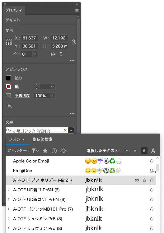 スクリーンショットで選択されているのはフォントファミリー(ウェイト:ふとさ)で、