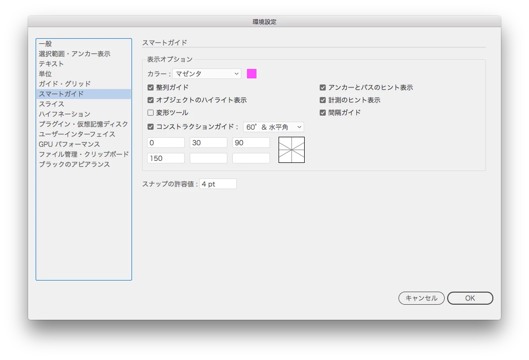 スマートガイドのことだと思われます。「メニューバー > 表示 > スマートガイド」のチェックを確認してみてください。