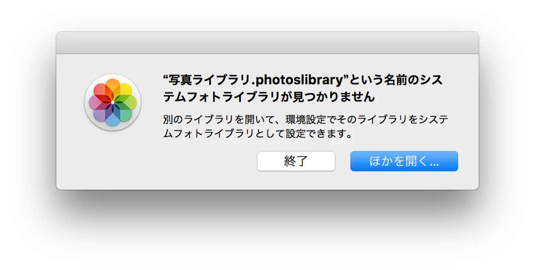 「写真.app」を起動し、以下のダイアログで「ほかを開く」でコピーしたphotoslibraryを指定