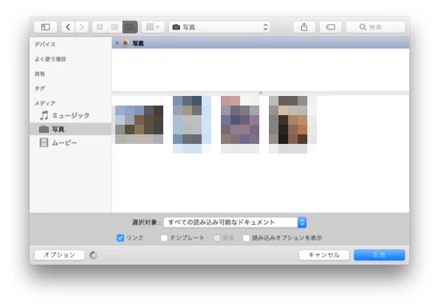 Illustrator CC 2018を起動、新規書類で「配置」を選択し、サイドバーからメディア>写真を選択したところ