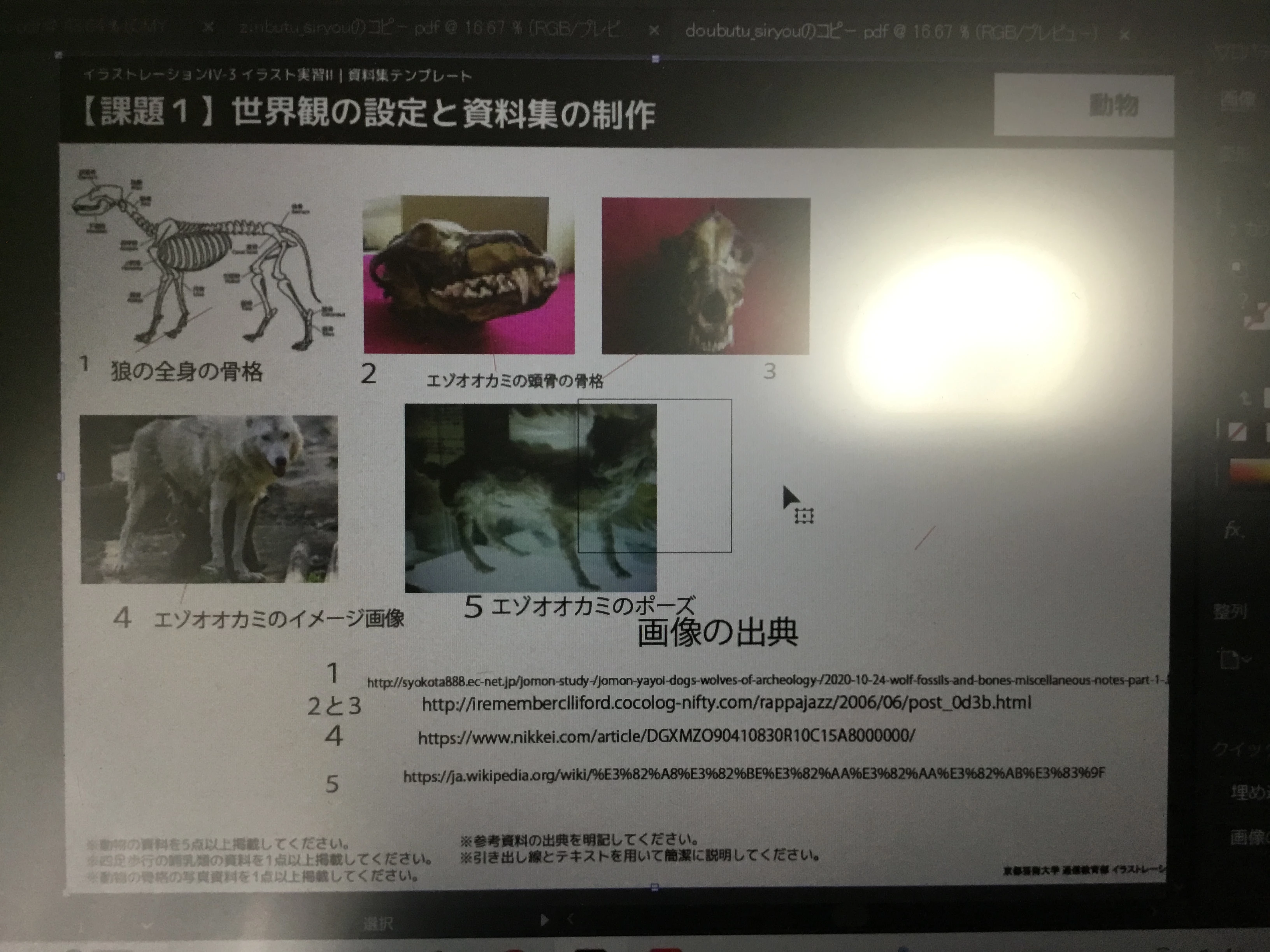 一枚目の画像の5のオオカミの写真のバックに正方形の線が見えています。それがアートボードで、PDFを書き出す際にはそのアートボードに収まった部分が書き出されます。画像を拡大縮小ツール等を利用して縮小し、その正方形内に収めれば正しく書き出されるでしょう。