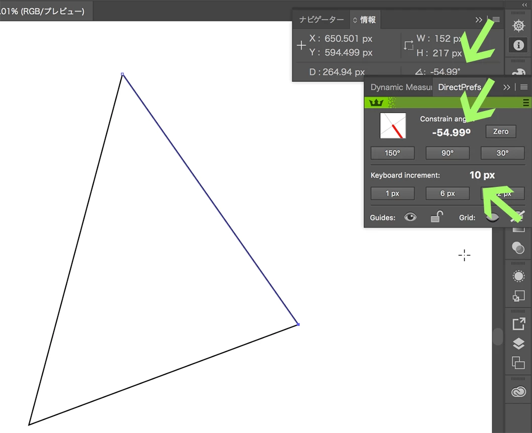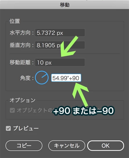今回の場合ですと、移動ダイアログで移動距離や角度の設定も可能ですし、
