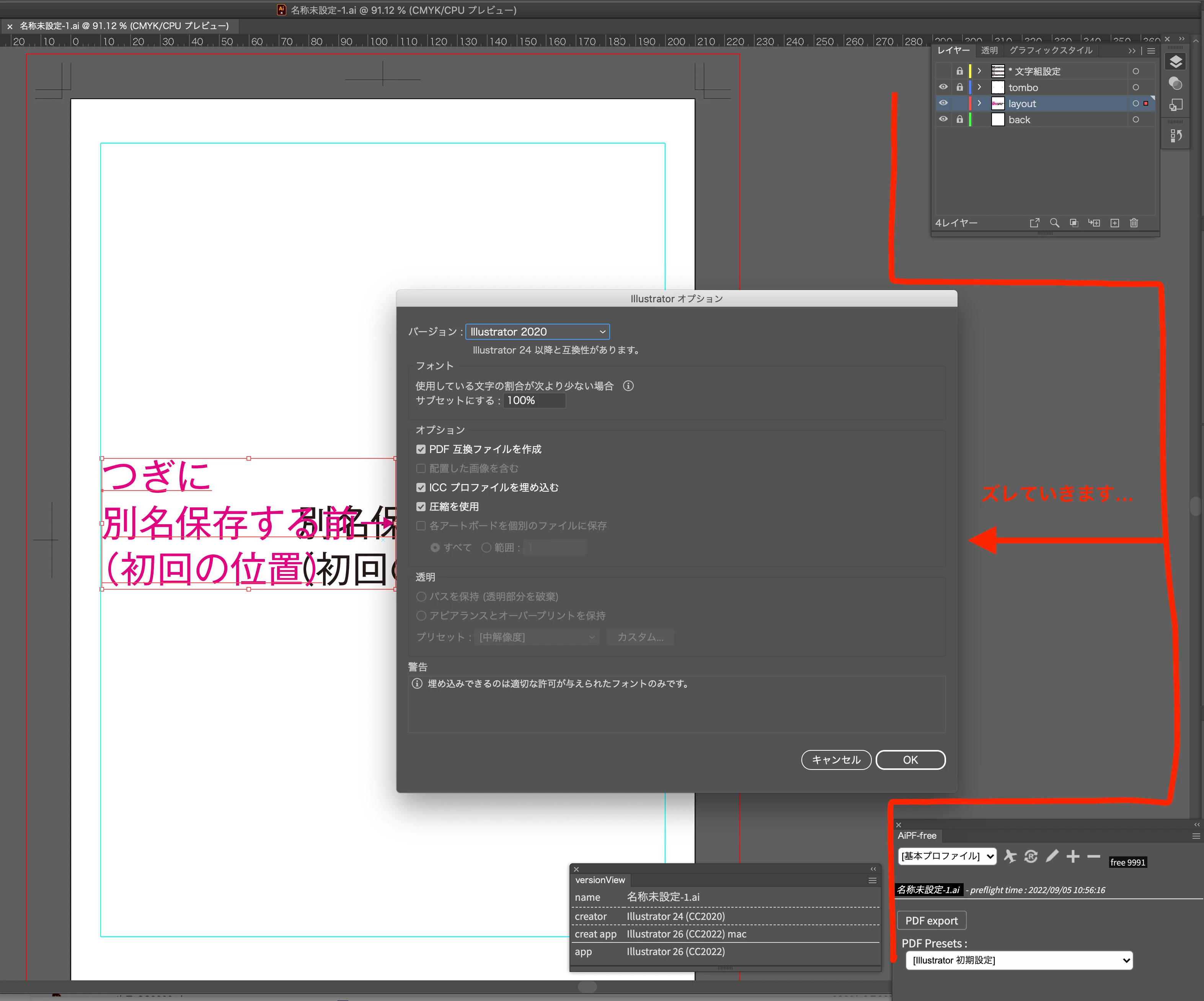 別名保存するたびに、Illustratorオプションの画面が少しずつ左に移動していきます。
