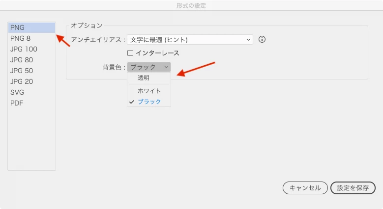 「PNG」のオプションから背景色を確認してください。