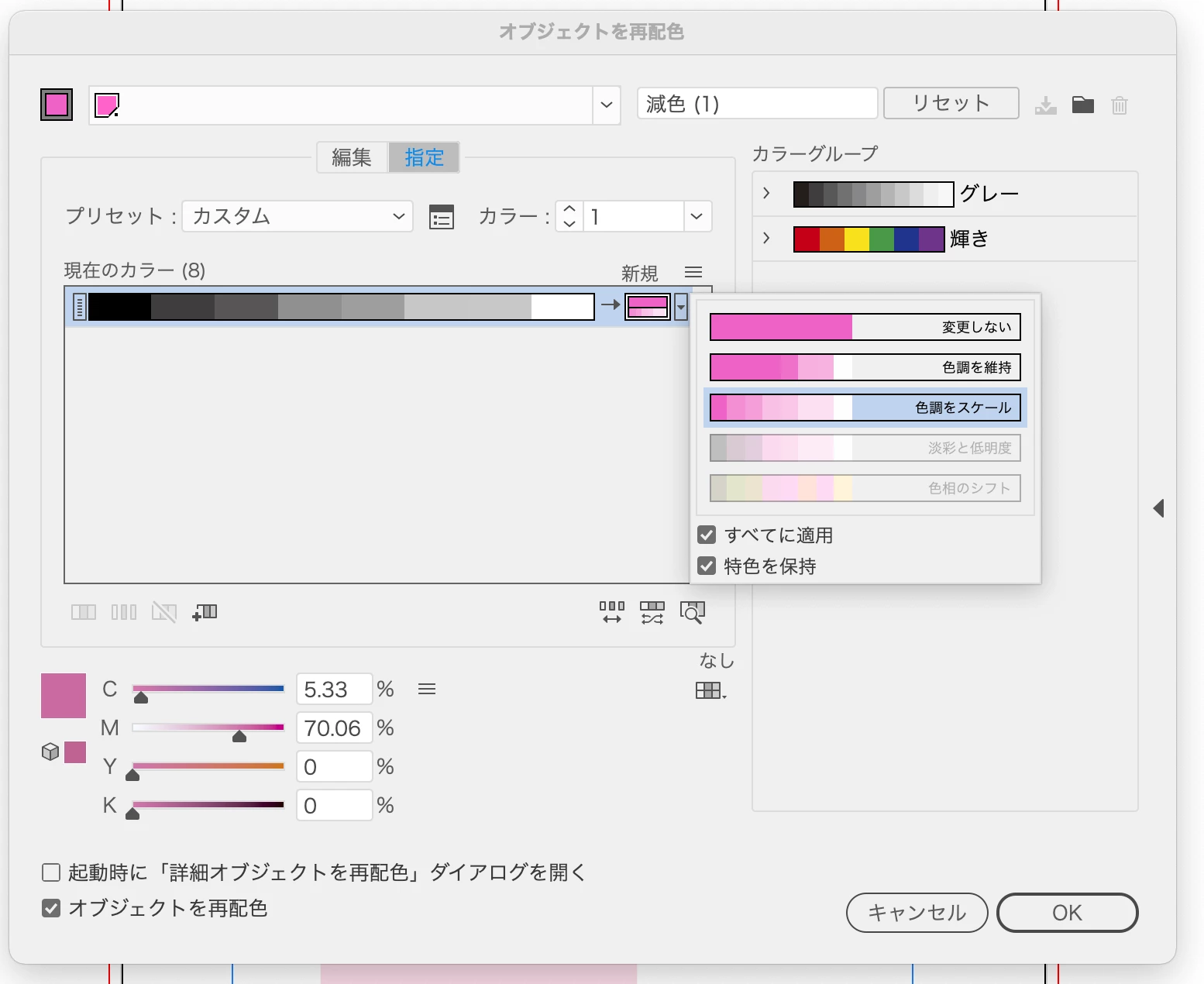 単色で構成されたオブジェクトの色を特色に%そのままで置き換えたいのですが効率的な方法あるのでしょうか。