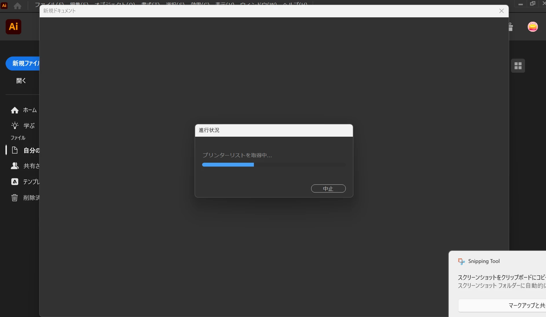 もともとあるイラレデータをひらくと「印刷リストを取得中」とウィンドウが出てから一向におわりません(休日の日に会社ではなく自宅でも試しましたが半日経ってもずっと取得中のままでした)