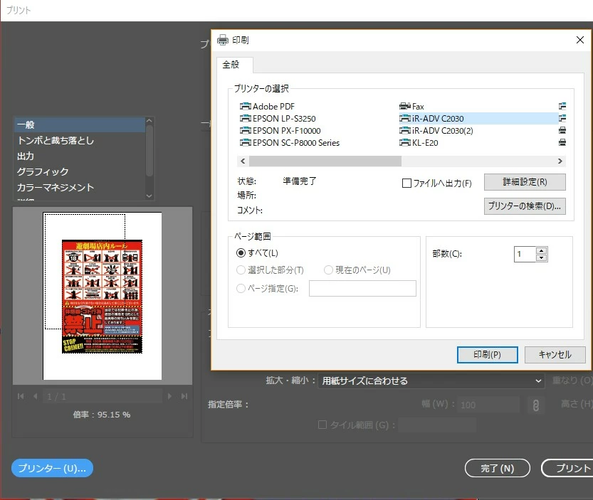 ファイル→プリント→現時点ではB1サイズ(デフォルト設定)でのプレビュー(倍率99.18%)→左下プリンター設定押下→詳細設定→ページサイズA1変更→OK→印刷押下→プレビュー変わらず→再度左下プリンター設定押下→詳細設定は押さず、そのまま印刷押下→プレビューが正しくなる(倍率80.78%)
