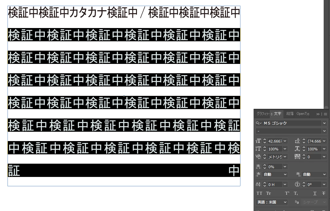 Illustrator26.5.3、Windows10での現象です。エリア内で均等割りの文字組をしていた際、途中で字切りが変わりました。