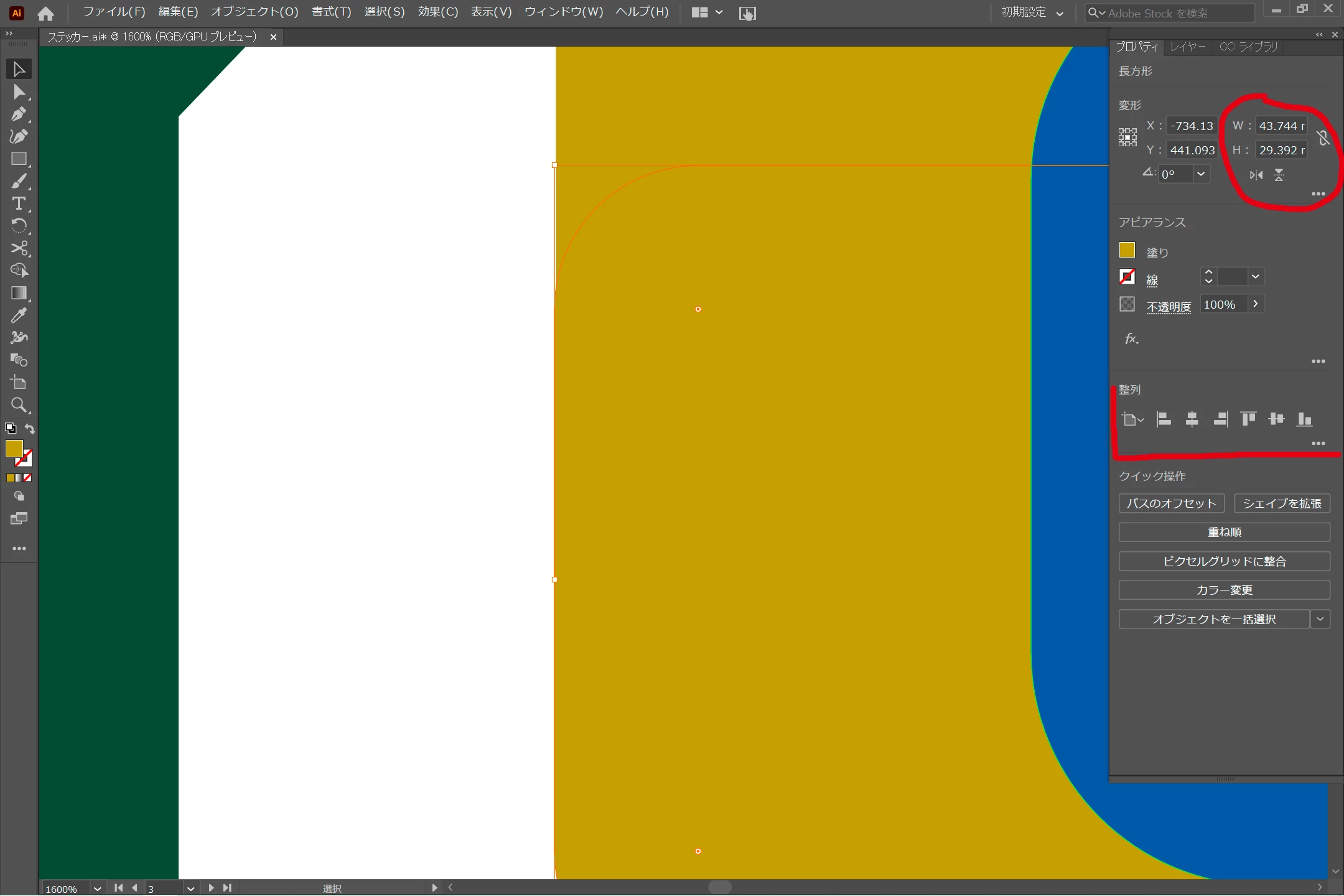 ①赤丸部分の数値が全く同じ2つの図形が、②赤線部分の整列ツールを使っても揃わない。という事でよろしいでしょうか。