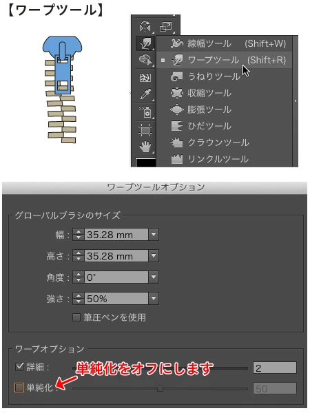 ツールバーにあるワープツールを使ってカーブをつけていきます。ワープツールをダブルクリックして「単純化」をオフにします。