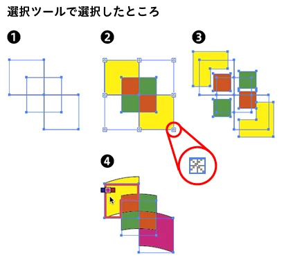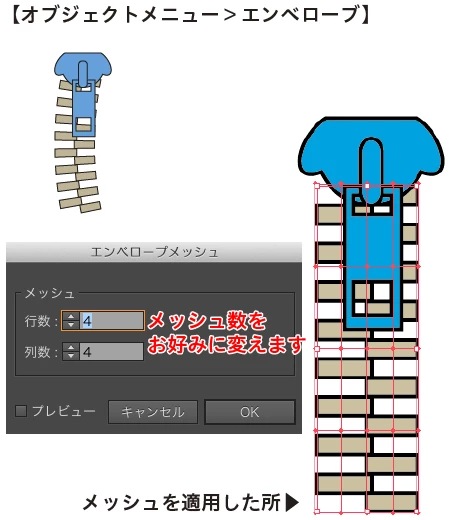 [オブジェクトメニュー>エンベローブ>メッシュで作成]を選択します。作成したメッシュはダイレクト選択ツールで編集できます。
