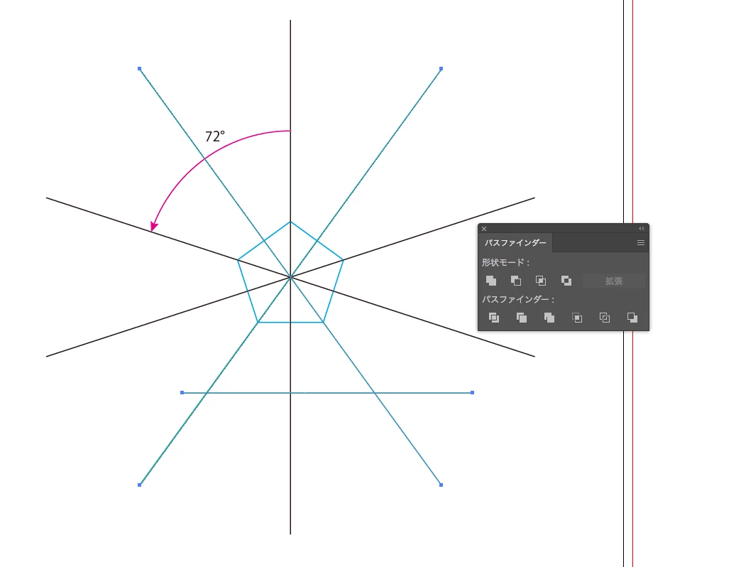 まず垂線を描きます。そして、その線を72°で回転します。それを4回繰り返すと添付の図の様に各頂点から対向する辺への垂線を描画できます。これを利用します。