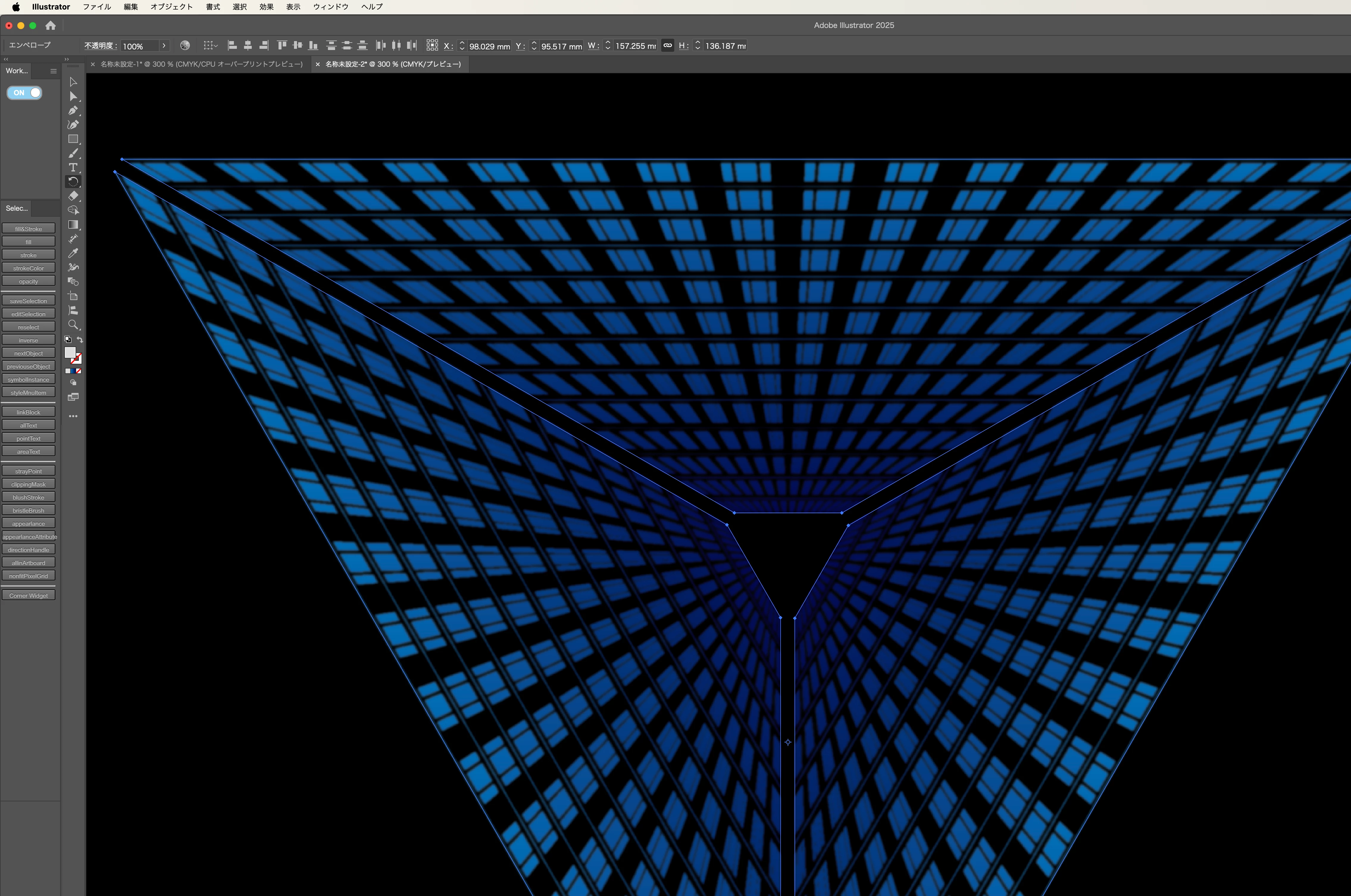 え〜と、破線で窓1コ作って水平コピー→ブレンド→上に水平の細線→双方選択して垂直方向に適当にコピー→全部選択してブレンド拡張・パスのアウトライン→グループ化して適当にグラデーションでも適用しておく→120°のガイドを引いてそこに壁面の変形部分の台形を作成→四角い壁面パーツと台形を選択してエンベロープの最前面のオブジェクトで作成を適用→中心基準で120°でコピー→不透明度、光彩、ぼかし等で適当に味付け。