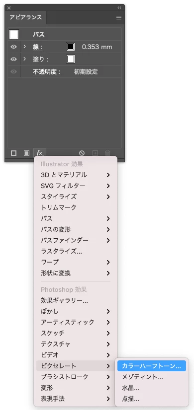 アピアランスパネル、またはメニューバーの「効果」から実行するものです。