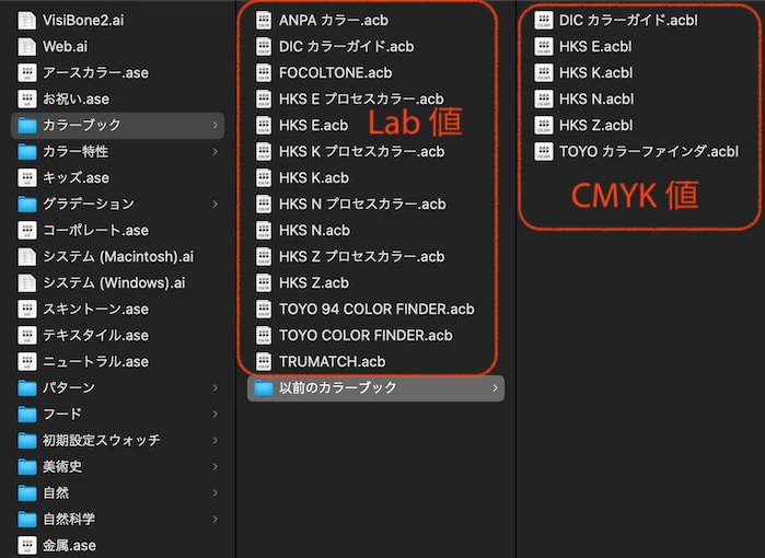 その後 Photoshop も含め Lab ベースでのスウォッチに変わったのですが、このスウォッチの場合は印刷方法や用紙などで CMYK 値が変化します。(現在では Photoshop には Lab ベースでのスウォッチしかありません。)