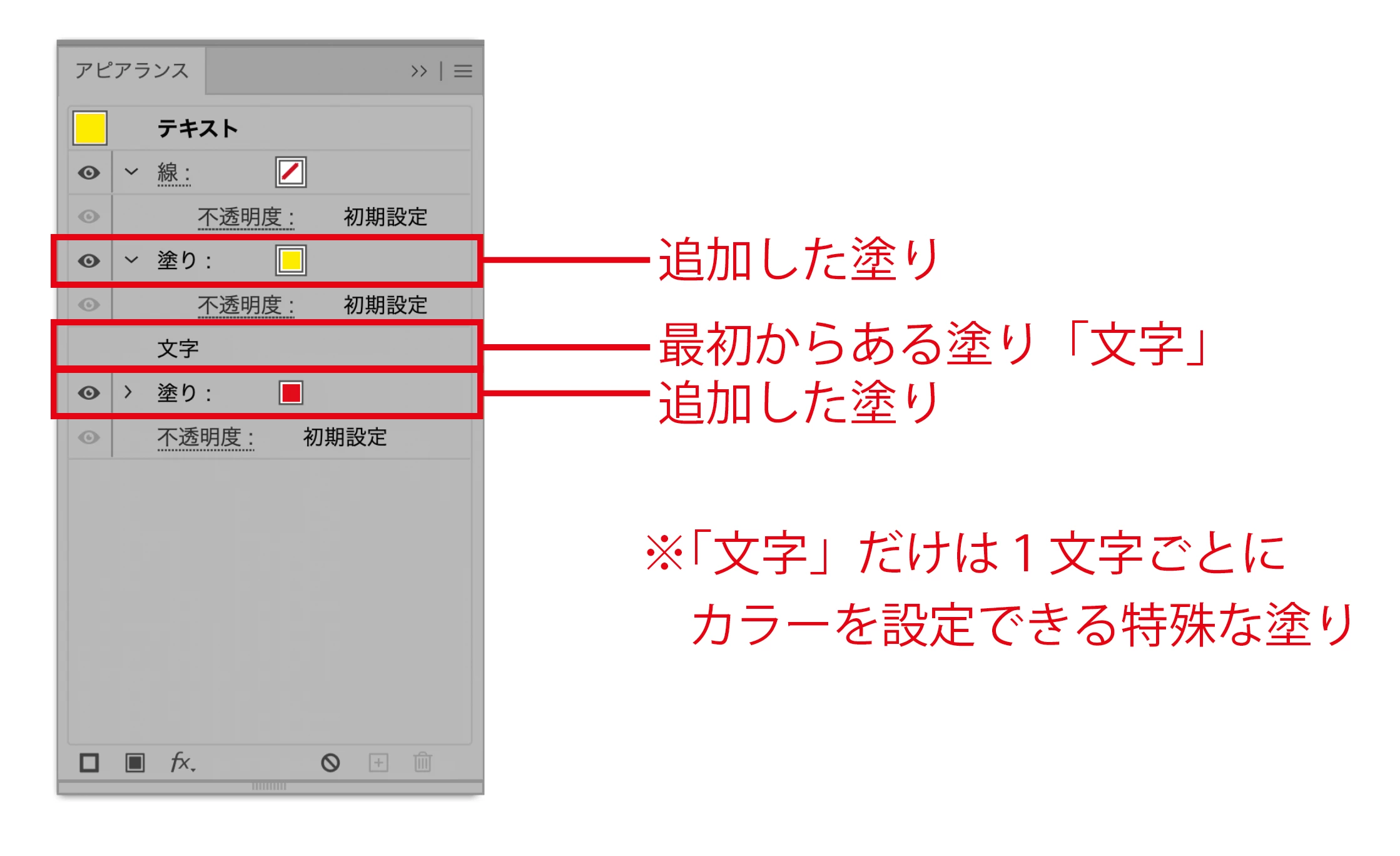 があり、さらにアピアランスによって文字オブジェクト全体に設定できる「塗り」を複数設定できます。