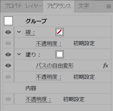アピアランスパネルでグループに対して塗りを設定すると、もともとのオブジェクトの持っている塗りに加えて「グループに対して設定される塗り」が付け加わる感じになるので、今はその「グループに対して設定される塗り」に対してだけ効果が設定されています。