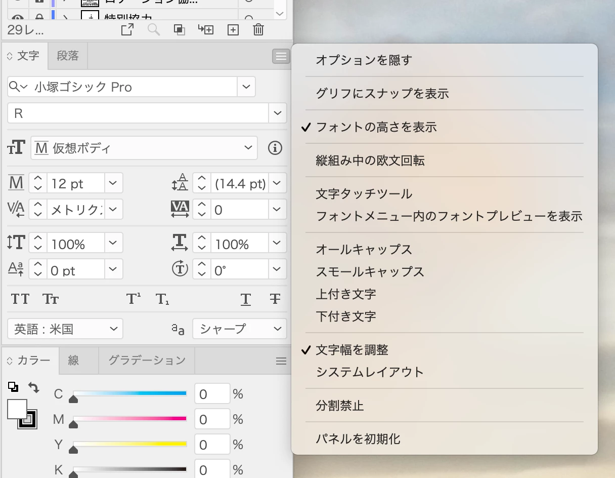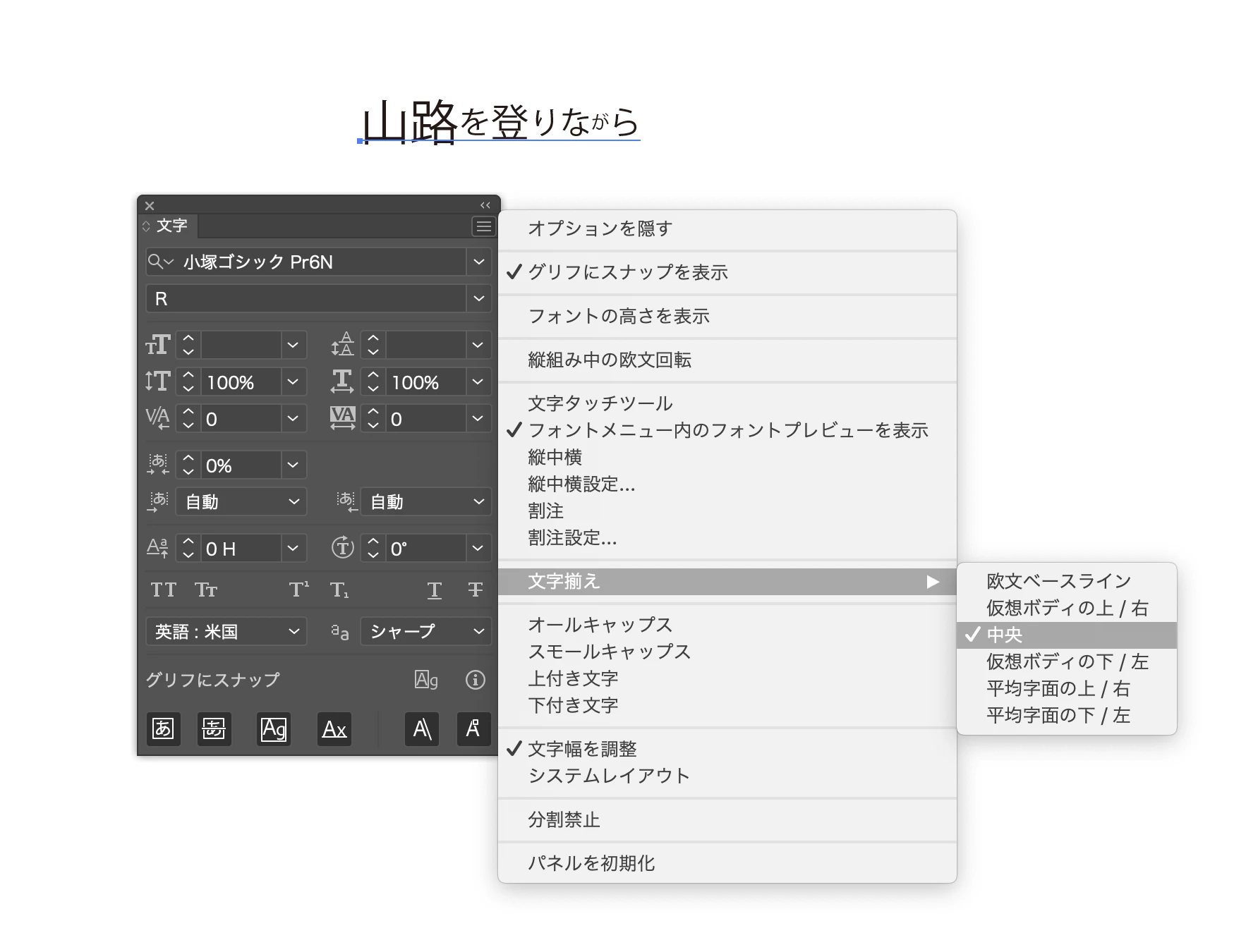 文字パネルメニューに文字揃えが表示されません。