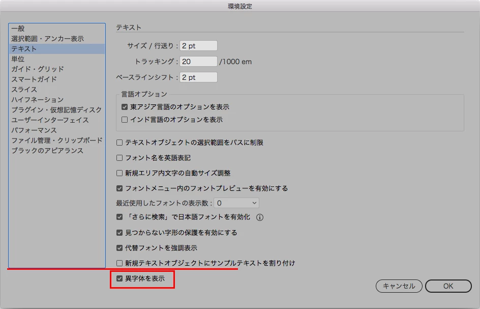 「新規テキストオブジェクトにサンプルテキストを割り付け」のチェック