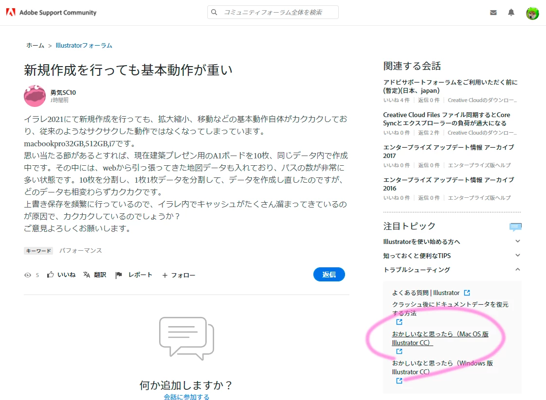 イラレ2021にて新規作成を行っても、拡大縮小、移動などの基本動作自体がカクカクしており、従来のようなサクサクした動作ではなくなってしまっています。macbookpro32GB,512GB,i7です。