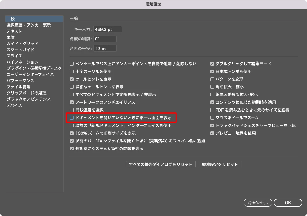 環境設定 > 一般  >  「ドキュメントを開いていないときにホーム画面を表示」