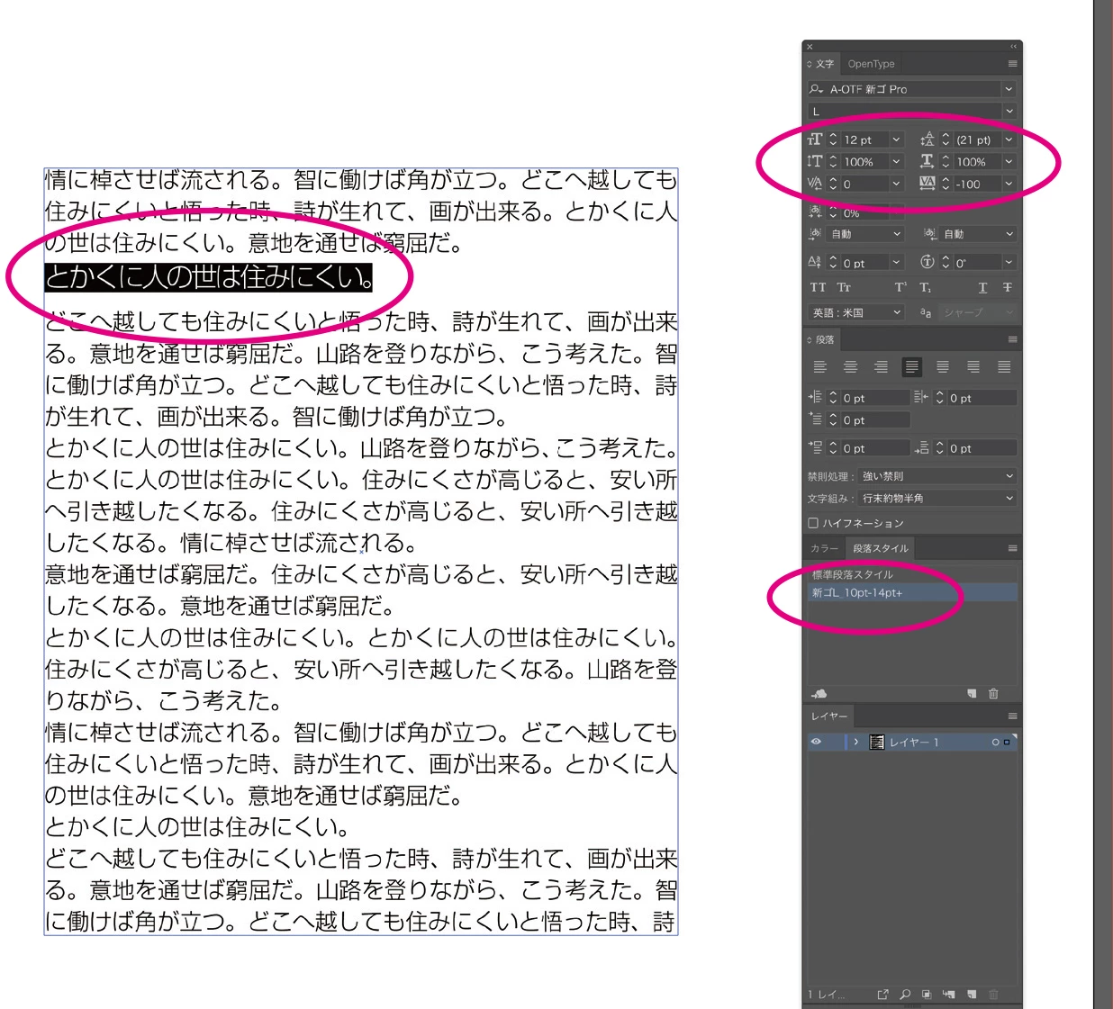 段落スタイルで文字サイズ10pt・行送り14ptにし、一部の文字列に対してトラッキング-100をかけました。