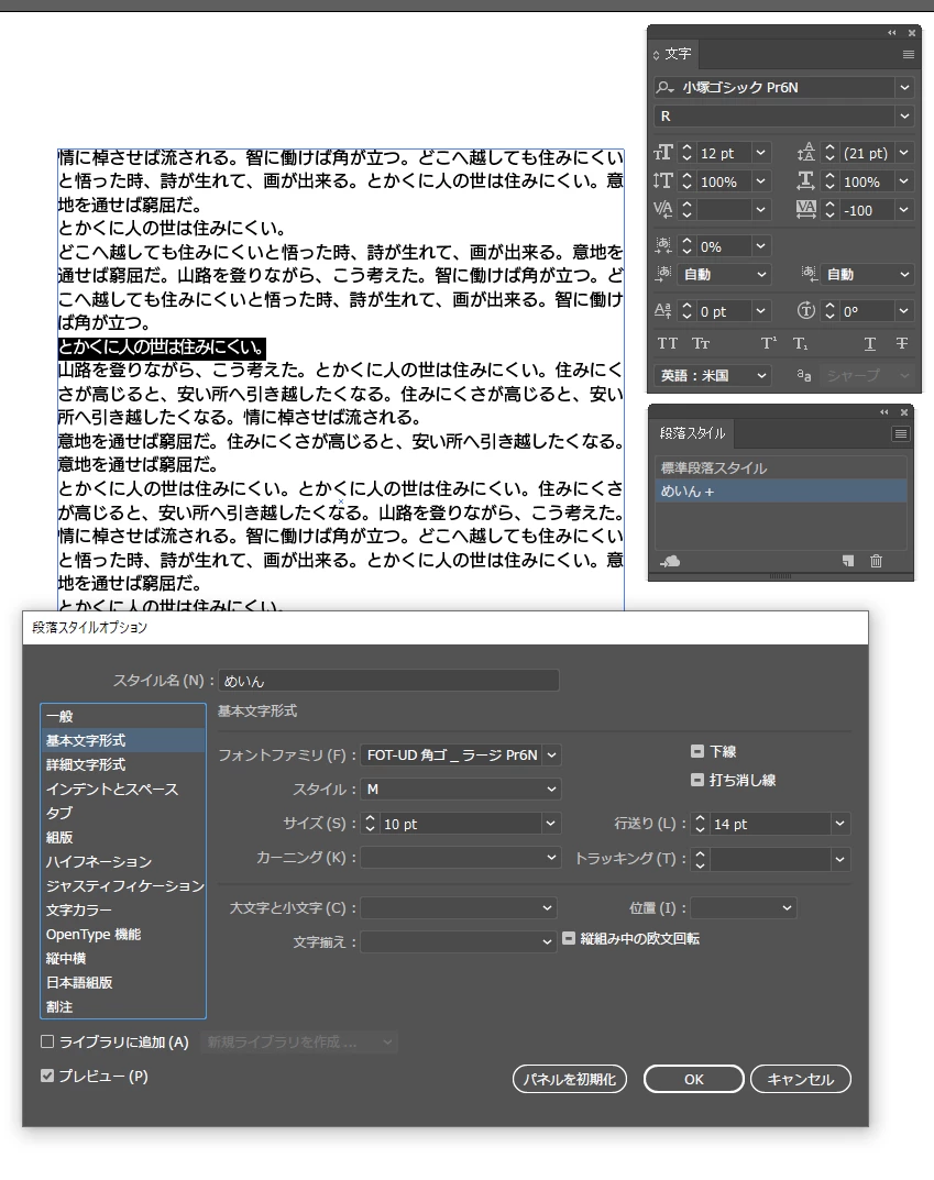 下記にスクリーンショットを提示しておきますが、文字パネルが小塚ゴシック等に変わっているのは