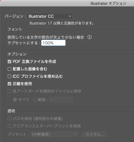 ちなみに蛇足ですが、もし印刷出力用のデータなら、PDF互換のチェックはONで運用するべきでしょう。