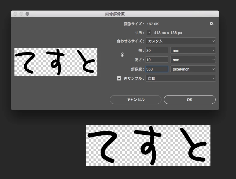 紙に描いた手書きの文字をスキャンで読み込み、その読み込んだ手書き文字をフォトショップで背景透明にする加工を加えて、pngで保存して、それからイラストレーターで画像のサイズを横3cm 縦1cm以内になるように、カスタムで変更したのですが、デスクトップに保存して、いざ印刷するために、イラストレーターのA4に埋め込みで画像を持ってくると横3cm 縦1cmの画像になっておらず、大きいです。