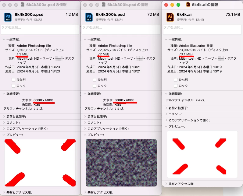 ファイル容量については画像のレイヤーの有無やai形式の保存オプション如何でいくらか変動しますが、