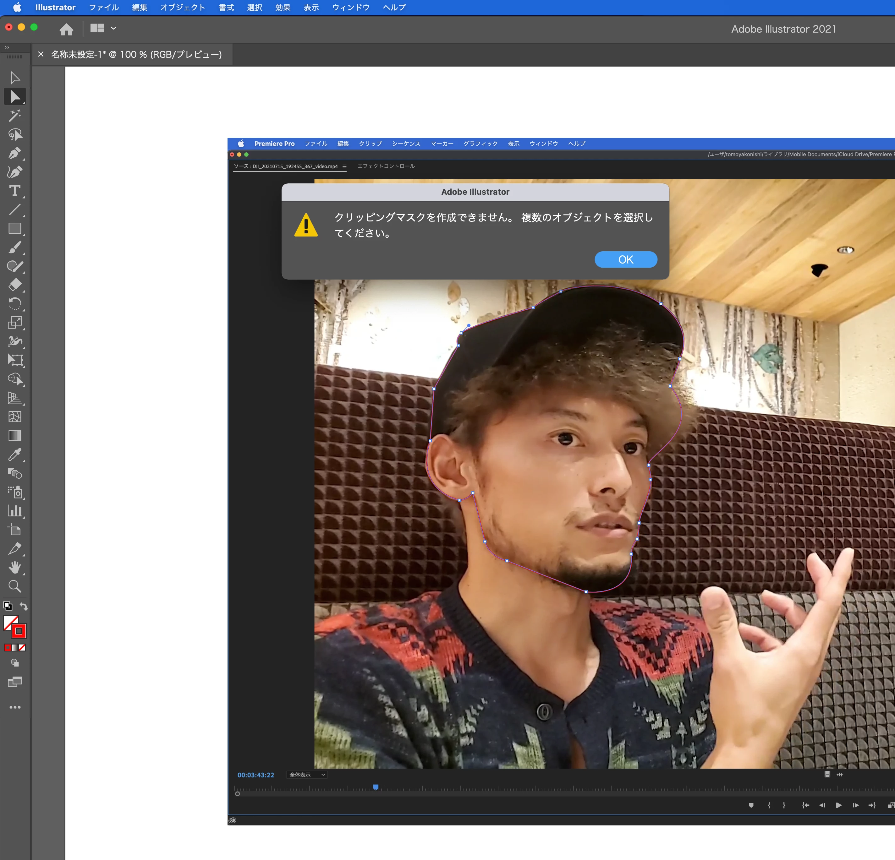 「AをBで切り抜く」指定がクリッピングマスクです。現状は、キリヌキのパス(=B)しか選んでいませんからその警告が出ます。