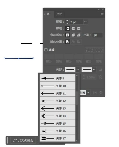 直線ツールで直線を引く→ウインドウから線パネルを開き、書きたい矢印を選択すると